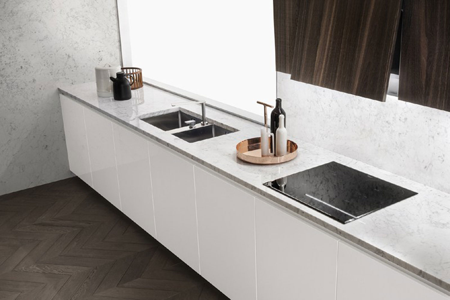 Un classico rivisitato per una proposta caratterizzata dalla semplicità del layout dove ogni elemento compositivo è ridotto alla propria geometria fondamentale, in cui diventano protagoniste le ampie superfici del piano in acciaio e vetro o l’abbinamento fra marmo carrara e bianco lucido.